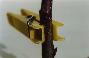 C'est mon truc qui permet le positionnement parfait du greffon sur le sujet et qui laisse les deux mains libres pour effectuer la ligature. On pourra prévoir deux pinces à linge différentes (voir photographie) dont une 'coupée', pour les petits diamètres. -